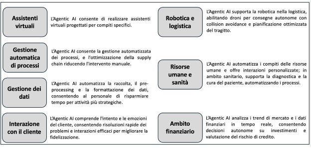 È anche per rispondere a queste fragilità che molte organizzazioni italiane stanno accelerando l’adozione di soluzioni di Intelligenza Artificiale. In particolare, i sistemi di Agentic AI – agenti software capaci di pianificare, prendere decisioni ed eseguire azioni in autonomia – stanno iniziando a entrare nei processi quotidiani di enti pubblici, aziende sanitarie e imprese. La figura 1 illustra alcuni esempi di utilizzi. A differenza dell’automazione tradizionale, questi sistemi non si limitano a eseguire regole predefinite, ma operano su obiettivi, interpretano contesti e interagiscono direttamente con strumenti e infrastrutture critiche. In un Paese caratterizzato da forte pressione operativa, carenza di personale specializzato e crescente esternalizzazione dei servizi digitali, la promessa è quella di maggiore efficienza e continuità operativa.