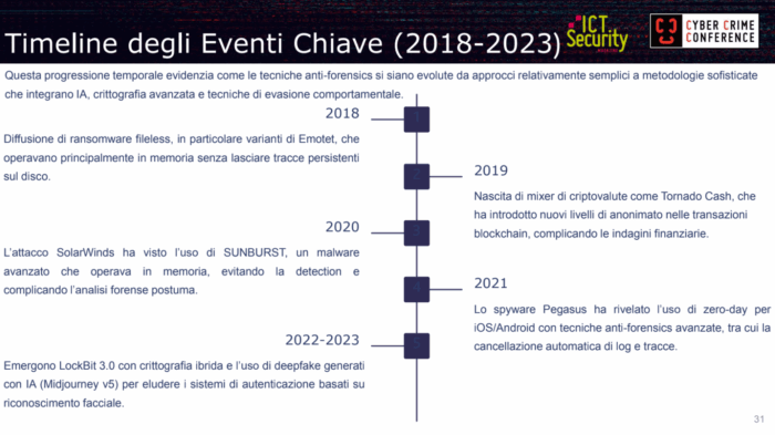 Come ha sintetizzato il relatore, «l’evoluzione delle tecniche anti-forensi ha subito un’accelerazione significativa negli ultimi anni, dovuta all’accelerazione tecnologica generale e alla crescente sofisticazione degli attori delle minacce».