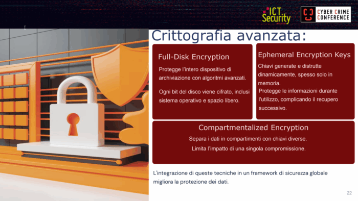 Se esiste un settore dell’anti-forensics che rappresenta una sfida ardua per gli investigatori è senza dubbio la crittografia avanzata, definita «il problema più spinoso nell’ambito delle analisi forensi» dal relatore, il quale ha individuato tre principali varianti di questa tecnica.