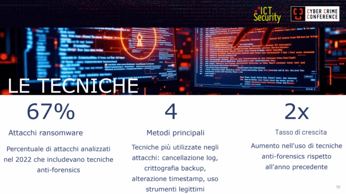 Lungi dall’essere un’esagerazione, si tratta di una constatazione supportata da dati concreti: secondo un recente sondaggio citato nell’intervento, ben il 67% degli attacchi informatici analizzati includeva tecniche anti-forensi, con un tasso di crescita raddoppiato nell’ultimo anno.