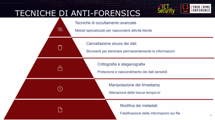 Il relatore ha aperto la presentazione evidenziando come «gli strumenti e le tecniche di anti-forensics si stiano rivelando un ostacolo formidabile per la comunità forense digitale».