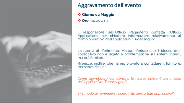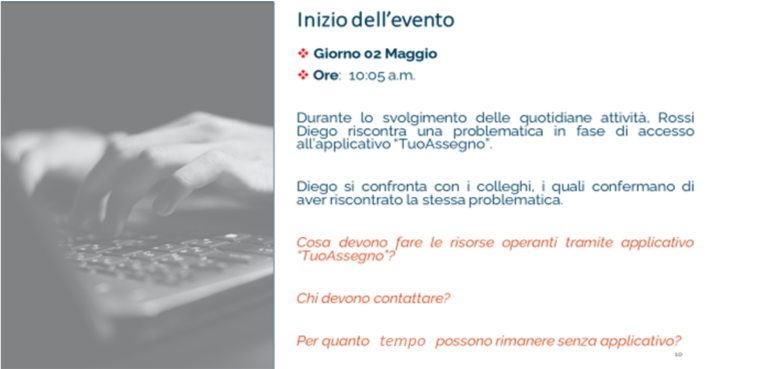 Il Business Continuity Manager (o suo sostituto), una volta radunati in presenza o da remoto tutti gli utenti tester, inizierà a condividere lo scenario, eventuali aggravamenti del rischio ed input, su cui i partecipanti dovranno fare delle valutazioni e considerazioni e definire come gestire l’evento.