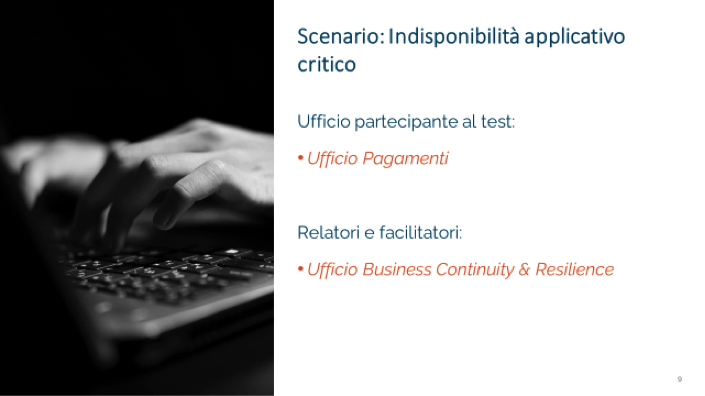Di seguito, un esempio di come impostare una presentazione per un test in modalità “Walkthrough”: nell’esempio riportato è stato coinvolto un solo ufficio e si è ipotizzato che il processo riesca ad essere portato avanti tramite lavoro manuale in caso di mancanza di applicativo (è ovviamente possibile arricchire gli scenari, il numero dei partecipanti e il modo in cui sono impostate le slides).