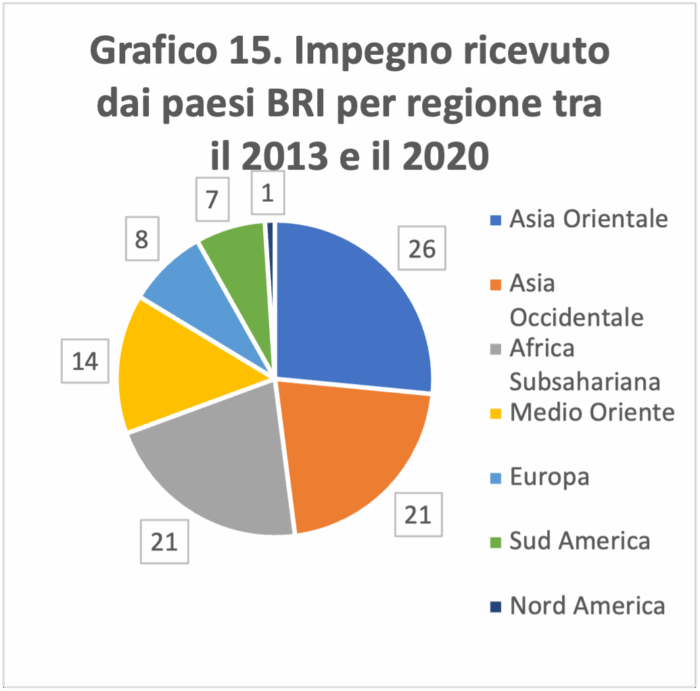 L’impegno della BRI cinese non è stato distribuito uniformemente tra tutte le regioni (grafico 17). I Paesi africani e asiatici hanno ricevuto infatti la quota maggiore di investimenti cinesi.