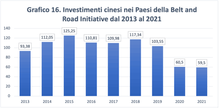 La Belt and Road Initiative è una delle iniziative infrastrutturali più ambiziosi di sempre, a cui hanno aderito ben 145 Paesi e 29 organizzazioni internazionali mediante la firma di accordi di cooperazione. I Paesi aderenti stanno realizzando progetti infrastrutturali, utilizzando prestiti cinesi a basso interesse, il che ha comportato un vertiginoso aumento del debito complessivo verso la Cina, superando il 20% del prodotto interno lordo in alcuni Paesi, secondo dati elaborati dal Council of Foreign Relations[19]. Il governo cinese ha inoltre compiuto i primi passi per incorporare nell’iniziativa strategie e obiettivi sostenibili dal punto di vista ambientale. Negli ultimi anni, tuttavia, gli investimenti diretti esteri cinesi verso i Paesi della BRI hanno registrato una significativa diminuzione (grafico 16).
