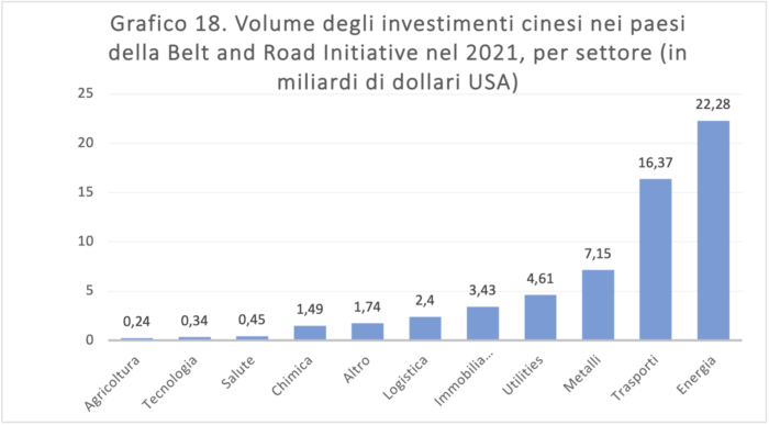 Il Paese con il maggior volume di costruzioni finanziate è stato l’Iraq, con circa 10,5 miliardi di dollari[26], seguito da Serbia (circa 6,8 miliardi di dollari) e Indonesia (circa 2,4 miliardi di dollari). Rispetto al 2020, l’impegno nella costruzione in Vietnam è sceso da 3,1 miliardi di dollari a 430 milioni di dollari. In termini di investimenti, i Paesi africani e mediorientali hanno raccolto una quota sempre più ampia dell’impegno cinese, passando dall’8% nel 2020 a circa il 38% nel 2021[27], mentre gli investimenti nel 2021 nei Paesi europei sono diminuiti dell’84% rispetto ai primi sei mesi del 2020. Come detto, il focus della BRI è incentrato sulle infrastrutture, in particolare energia e trasporti.
