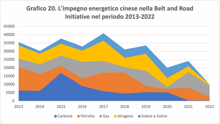A livello nazionale, come possiamo vedere dal grafico 20, l’impegno cinese per la neutralità dal carbonio trova riscontro nel finanziamento di progetti energetici eco-sostenibili. A testimonianza di ciò si segnala il rifiuto dell’ICBC, una delle maggiori banche statali cinesi, nel finanziare una centrale elettrica a carbone da tre miliardi di dollari nello Zimbabwe[29].