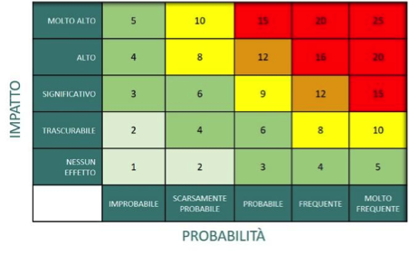 Tali valutazioni fanno riferimento alla “Risk Matrix”, dove un rischio è calcolato secondo l’equazione