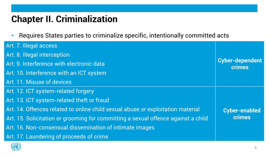 D’altra parte, la Convenzione di Budapest includeva un reato non presente nella Convenzione ONU, relativo alla violazione della proprietà intellettuale o del copyright.