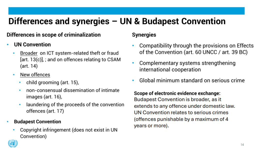 Prichard ha sottolineato che la nuova Convenzione ONU è «molto simile alla Convenzione di Budapest nella maggior parte delle sue disposizioni operative» ed è «deliberatamente concepita come sua integrazione».