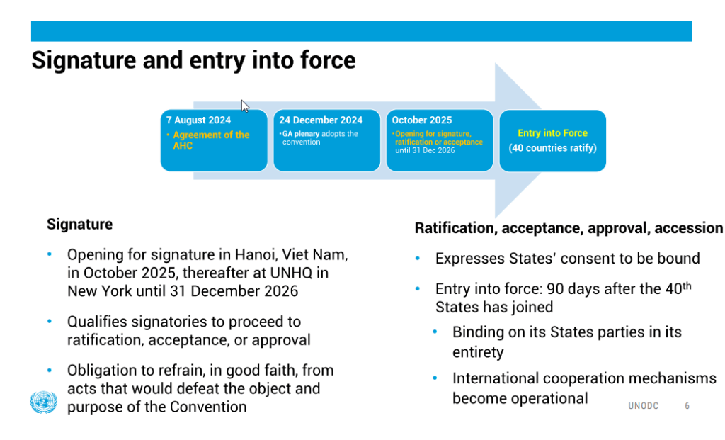 Prichard ha ricordato che nell’ottobre 2025 si terrà la cerimonia di firma ad Hanoi, in Vietnam; a partire da quel momento, il trattato rimarrà aperto alla firma fino al dicembre 2026. Successivamente i paesi dovranno procedere con il processo di ratifica, che varia da nazione a nazione. La Convenzione entrerà in vigore dopo che almeno 40 paesi l’avranno ratificata.