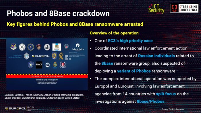 Di grande rilevanza è stata anche l’operazione che ha portato alla chiusura dei gruppi ransomware Phobos e 8Base, con l’arresto di due importanti criminali informatici: uno in Italia, nel 2023 (su mandato di arresto francese) e l’altro in Corea del Sud, nel 2024.
