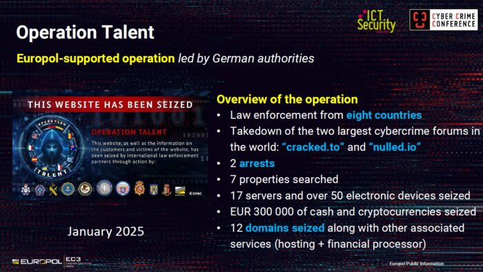 Passando ad attività più recenti, il relatore ha descritto l’operazione Talent, avviata a gennaio 2025 dalle autorità tedesche, che ha portato alla chiusura di due risorse fondamentali nell’ecosistema del cybercrime internazionale.