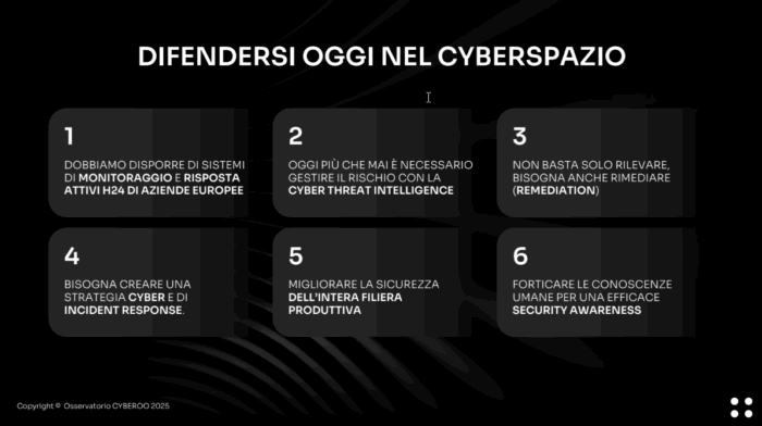 L’analisi proposta da Bonora ha incluso la dimensione empirica attuale attraverso la presentazione dei dati raccolti dall’Osservatorio Cyberoo 2025, che offre una panoramica delle minacce informatiche registrate nell’anno precedente.