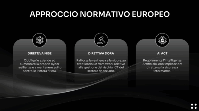 Riferendosi al panorama normativo europeo, caratterizzato da strumenti come la direttiva NIS2, il regolamento DORA e l’AI Act, Bonora ha osservato come «l’approccio normativo oggi privilegia ancora la precauzione rispetto all’innovazione».