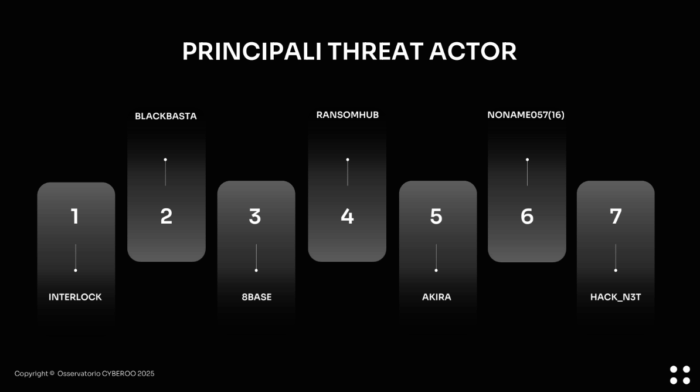 «Abbiamo visto più di 350 threat actor» ha dichiarato, sottolineando come alcuni di questi gruppi criminali si presentino con una propria morale: «Interlock dice “ti attacco solo se non sei già stato attaccato”, Ransom Hub “io non attacco le ONLUS”, qualcun altro “faccio un attacco solo per dimostrarti che hai usato male i dati dei tuoi dipendenti, dei tuoi clienti o dei tuoi fornitori”».