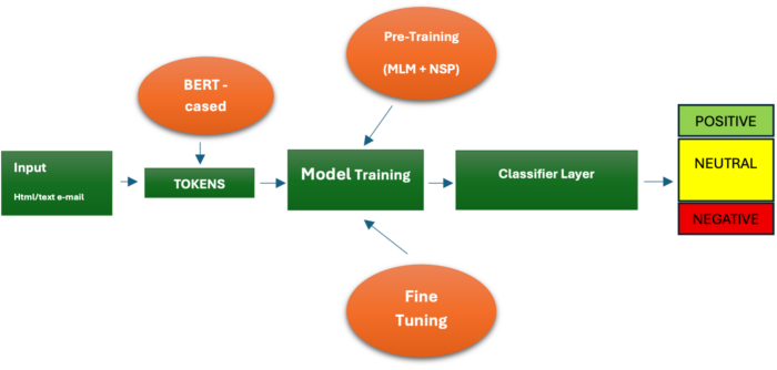 NLP analizza il contenuto dell’e-mail in due passi. Il primo passo è un processo di formazione/addestramento che comprenda la vettorializzazione del testo, in un formato opportuno per l’intepretazione da parte dell’algoritmica intelligente a partire dal contenuto originale. In questo processo il testo, o eventualmente un contenuto multimediale incluso nell’e-mail, viene analizzato (rif. BERT – Bidirectional Encoder Representations from Transformers, 2018) e tradotto in un formato intelliggibile dall’algorimica di analisi, considerando anche aspetti semantici quali il tono del contenuto o sfumature riconducibili alla sfera dell’empatia (sentiment).