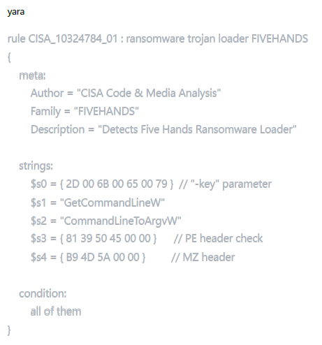 - NCC Group. (2021). FiveHands Ransomware Technical Analysis and Attribution Assessment. NCC Group Research. https://research.nccgroup.com/2021/06/15/handy-guide-to-a-new-fivehands-ransomware-variant/