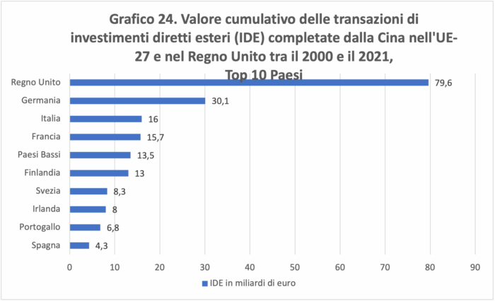 [129] L’UE è la prima destinazione delle esportazioni cinesi. La Cina è il terzo partner commerciale dell’UE e la terza destinazione delle esportazioni dell’UE (dopo Stati Uniti e Regno Unito). Tra il 2000 e il 2020, le aziende dell’UE hanno investito circa 148 miliardi di euro in Cina e le società cinesi circa 117 miliardi di euro nell’UE. Per un approfondimento si veda: Trade.ec, “Eu-China Comprehensive Agreement on Investment”.
