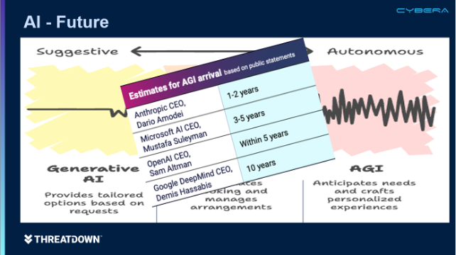 «Quando ho iniziato queste slide tre mesi fa, la parte di cyber defense era veramente verso la Generative AI. Ad oggi si comincia a parlare di agenti», osserva lo speaker, evidenziando la rapidità con cui questo settore evolve. Secondo alcune previsioni citate durante l’intervento, il raggiungimento dell’AGI potrebbe avvenire in un arco temporale compreso tra uno e dieci anni.
