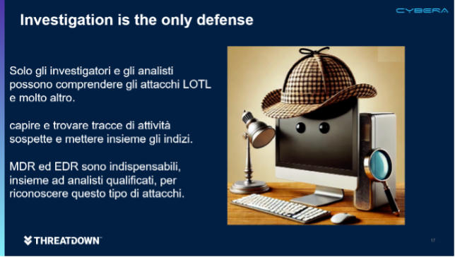 «Non pensate neanche di proteggere un ambiente, una rete, una compagnia senza questi due tipi di protezione – uno è un servizio e uno è un prodotto. Non è possibile identificare questo tipo di minacce senza un EDR, senza un MDR», afferma categoricamente l’esperto. L’investigazione condotta da analisti qualificati rimane l’unica difesa reale contro attacchi che sfruttano tecniche LOTL e altre metodologie avanzate.