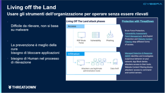 Una delle tecniche più insidiose analizzate durante l’intervento è il “Living off the Land” (LOTL), che consiste nell’utilizzare strumenti legittimi già presenti nei sistemi aziendali per condurre attività malevole.