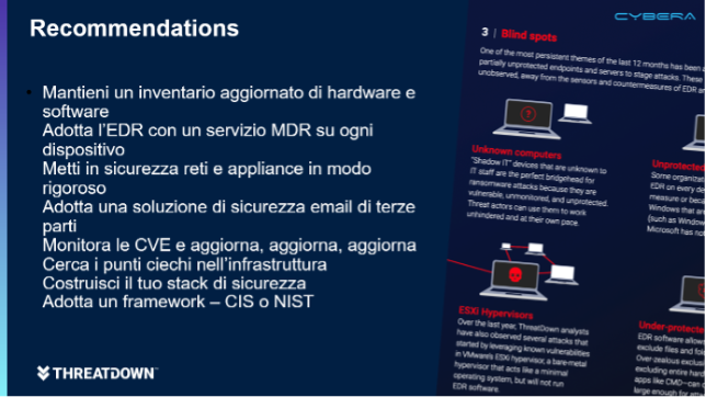 Le priorità individuate comprendono il mantenimento di un inventario aggiornato di hardware e software, l’adozione di EDR con servizio MDR su ogni dispositivo, la messa in sicurezza rigorosa di reti e appliance, l’implementazione di soluzioni di email security di terze parti, il monitoraggio costante delle CVE con aggiornamenti tempestivi, l’identificazione dei punti ciechi nell’infrastruttura, la costruzione di uno stack di sicurezza coerente e l’adozione di un framework di riferimento come CIS o NIST.