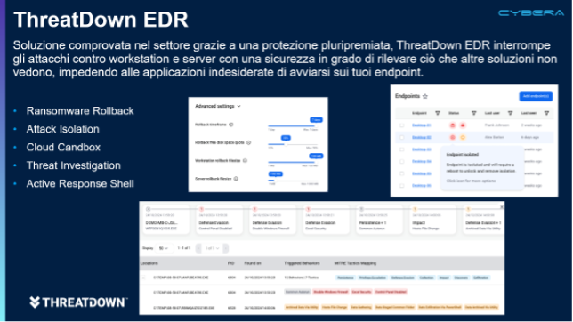 La presentazione illustra infine le caratteristiche della piattaforma Threatdown EDR di Malwarebytes, una soluzione che combina tecnologie avanzate di rilevamento basate su intelligenza artificiale, isolamento degli endpoint e una funzione proprietaria di ransomware rollback.