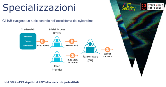Un altro trend significativo identificato nel 2024 è l’ascesa degli “Initial Access Broker” (IAB), descritti dal relatore come «soggetti o gruppi che di fatto sono facilitatori per gli affiliati ransomware». Questi attori specializzati «forniscono credenziali di accesso o accessi già pronti a VPN, dispositivi o firewall» delle aziende bersaglio, creando un ponte tra la fase di compromissione e l’implementazione finale dell’attacco.