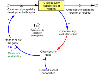 Un primo fattore variabile viene rappresentato dalla disponibilità di risorse (“Resource availability”): mezzi quali acquisti, protocolli, strumenti, tecnologie e personale costituiscono invero gli elementi costitutivi essenziali che consentono ad una struttura sanitaria di compiere gli sforzi necessari al fine di aumentare la capability development rate e di conseguenza incrementare lo stock delle attuali potenzialità ospedaliere. A sua volta ciò innescherebbe un accrescimento circa il livello di sicurezza informatica (“Cybersecurity level”), riducendo il divario fra il livello effettivo e quello desiderato di protezione, e, si capirà, laddove tale gap diminuisca, si attenueranno di conseguenza anche gli sforzi (“Efforts to fill out the gaps”) richiesti per colmare le lacune di sistema.