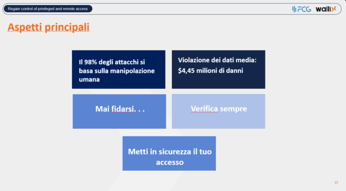 La giustapposizione di questi due episodi non è casuale: «uno interno (legato all’IT), uno esterno (legato all’accesso remoto). E noi siamo una soluzione che protegge gli accessi interni ed esterni» ha rimarcato Cavroy, delineando il perimetro d’azione di Wallix nel vasto campo della cybersecurity.