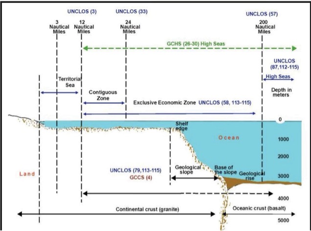 [6] Il diritto internazionale del mare si è tradizionalmente basato su un approccio spaziale, che suddivide gli oceani in diverse zone marittime con livelli variabili di sovranità e giurisdizione per gli Stati costieri. Questo schema, consolidato dalla Convenzione delle Nazioni Unite sul Diritto del Mare (UNCLOS), distingue tra acque territoriali, zona contigua, zona economica esclusiva (ZEE) e alto mare, attribuendo agli Stati diritti e doveri proporzionali alla distanza dalla costa. Sul punto, v. Hance D. Smith, Juan Luis Suárez de Vivero, Tundi S. Agardy – Routledge Handbook of Ocean Resources and Management, First Published 2015.