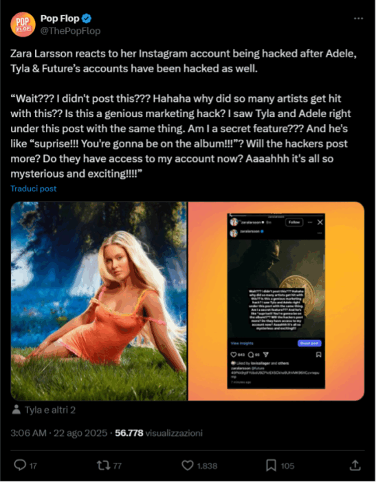 La conferma arriva dai casi più eclatanti. Nell’agosto 2025, il mondo dello spettacolo è stato scosso da un attacco coordinato che ha colpito simultaneamente i profili di Future, Adele, Tyla, Michael Jackson e Pink Floyd. Non un caso fortuito, ma un’operazione pianificata per promuovere una criptovaluta chiamata FREEBANDZ. Zara Larsson, anche lei coinvolta nell’attacco, ha immortalato lo stupore collettivo con un messaggio che è diventato virale: “Wait??? I didn’t post this??? Hahaha why did so many artists get hit with this??”