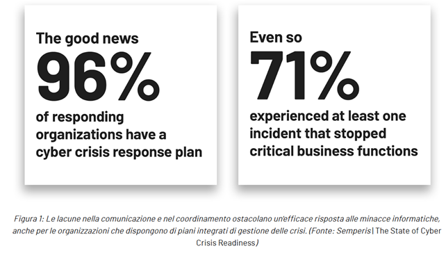I dati lo confermano. Secondo il report The State of Cyber Crisis Readiness di Semperis, che ha coinvolto 1.000 organizzazioni a livello globale, il 96% dichiara di avere un piano di risposta agli incidenti, eppure il 71% ha comunque subito eventi che hanno interrotto funzioni critiche del business.